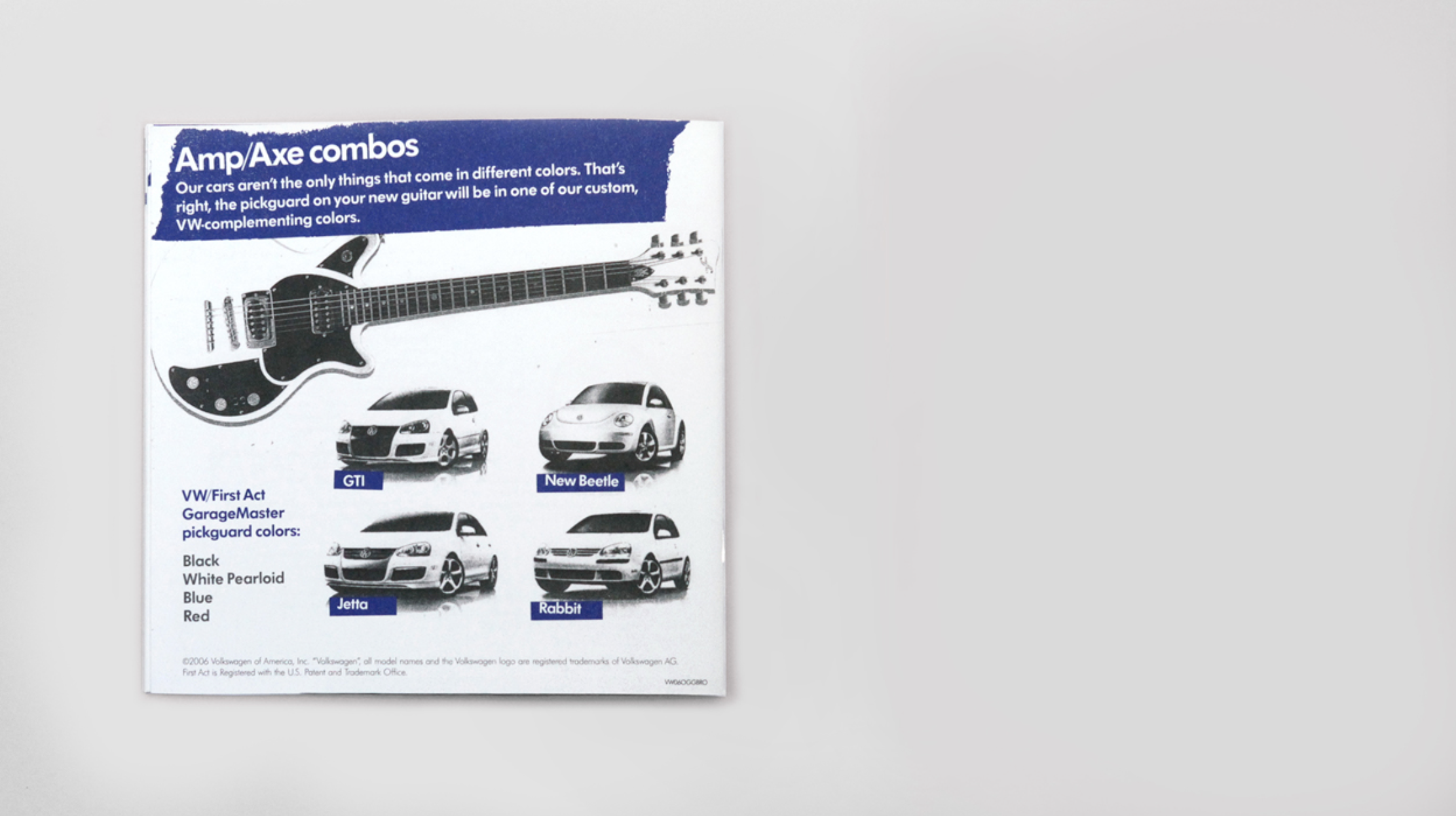 Drive up. Rock out. When you bought a VW, you received a custom First Act guitar that plugged directly into the stereo and allowed you to use the car's sound system as an amp. The guitar was branded with VW logos on the fret board and knobs. It also came with branded picks, a strap made out of a seatbelt, your vin number was engraved onto the neck plate, and even included book to show you the proper way to shred.